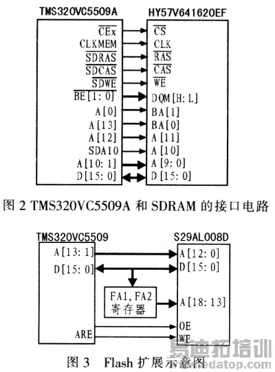 TMS320VC5509A内部仅有256 KB的RAM和64 KB的ROM,无法满足处理大量图像数据的需求,必须通过EMIF扩展外部存储器存放原始图像数据和应用程序。该系统外接Hynix公司HY57V641620EP SDRAM,其8 MB的存储空间用于存储图像数据;外接Spansion公司的S29AL008D Flash,其1 MB的存储空间用于存储应用程序和Boofloader。EMIF可与SDRAM无缝连接,接口连接如图2所示。由于TMS320VC5509A最大只能外扩16 KB的异步存储器,因此访问1 MB Flash需按分页方式访问,连接示意图如图3所示。