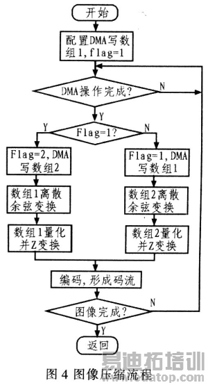 该系统采用JPEG压缩算法,该算法是将图像数据分成8x8的矩阵块、离散余弦变换、量化、Z(Zigzag)形扫描和Huffman编码,图像数据JPEG压缩时。需要分块处理DSP外围存储器中的图像数据。CPU对外围存储器的读写操作要慢于内部DRAM存储区。为提高图像压缩速度,在算法移植时,内部DARAM建立两个8x8的矩阵单元,DMA将外部存储器的图像数据以8x8的矩阵块为单元传输到到内部DARAM中的一个数组中,同时实现JPEG算法的分块操作。利用DMA与CPU并行工作的特性,在CPU操作一个块时,另一分块传输数据,两个数组交替进行,构成乒乓结构。图像压缩过程中需多次配置DMA,才能实现整个图像数据从外存到内存的传输和数据分块。数据块依次经离散余弦变换、量化、Z变换及哈夫曼编码,形成JPEG码流。图4为图像压缩的程序流程。
