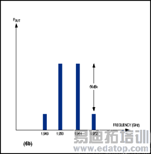 输出信号永远不会是输入信号完全准确的复制品,因为没有完全线性的晶体管。输出信号总是包含谐波,互调失真(IMD)和其他的寄生成分。在图4中,POUT公式中第二项叫做二次谐波或二阶失真,第三项叫做三次谐波或三阶失真。它们的特点都是在下一级的输入中出现由一个或两个频率的纯正弦信号组成的信号,它们在频率上紧邻。例如,MAX2681的三阶互调失真,就是包含1950MHz和1951MHz两个频率的-25dBm的信号。