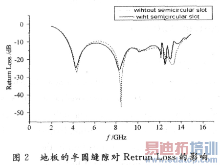如图2所示,其阻抗带宽为3.5~14 GHz,其中心频率为8.25 GHz。可以看出此结构具有两个谐振点,分别是4.27 GHz和8.34 GHz。地板的半圆缝隙降低了5~8.2 GHz这个频段的s11参数,对12~14 GHz有明显的影响,但对其他的频段没有什么影响。可见地板的半圆形缝隙的引入对s11参数影响不大。