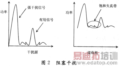 阻塞干扰 当接收机接收微弱的有用信号时,受到带外的强信号引起的接收饱和失真造成的干扰,称为阻塞干扰。阻塞干扰的产生与GSM接收机的通带外抑制能力,CDMA的载波发射功率、接收机滤波器特性等相关。阻塞干扰将导致GSM的接收机将因饱和而无法工作(如图2所示)。