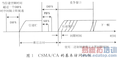 无线信道访问机制采用IEEE802.11 CSMA/CA机制。需要使用信道的节点首先侦听信道是否空闲,如果信道空闲且经过一个DIFS时序间隔后仍为空闲状态,那么发送节点直接开始发送分组数据;否则发送节点一直侦听信道直至信道最终空闲下来并且超过DIFS时序间隔,此时发送节点将启动退避机制。图1描述了CSMA/CA机制的基本访问方式。