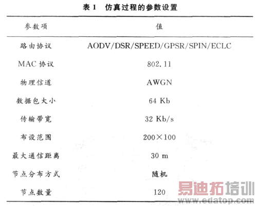 利用OPNET仿真平台对设计的通信协议进行了仿真,在200×100的区域中,共随机布设了120个节点,仿真环节的各项参数设置如表1所示。