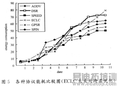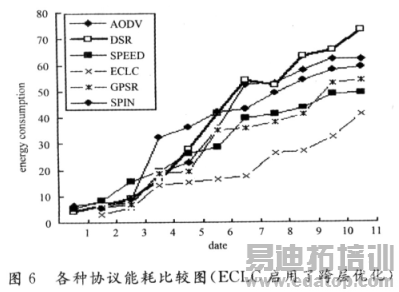 图5表示了AODV,DSRE,SPEED,GPSR,SPIN(MAC层采用802.11协议),ECLC六种协议在传输相同数据量的条件下的能耗特性,可以看出:与其他几种协议相比,未使用跨层交互机制时几种协议能耗特性相差较小,原因是几种协议的MAC层访问机制相同;而在开启跨层优化功能后,ECLC可以很好地避免冲突与网络拥挤,因而减少了能量浪费。图5是未开启跨层优化时各种协议的能耗比较;图6是开启跨层优化后各种协议的能耗比较。