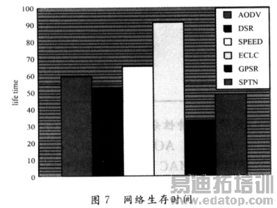 在仿真路由协议对网络生存时间的影响时,选择节点死亡数目超过1/3的时刻作为WSN的失效时刻,即在仿真时,当死亡节点数量达到40时,表示WSN死亡。图7表示了多次仿真取算术平均值的网络生存时间比较图。从图中可以看出,ECLC可以最大限度地延长网络生存周期,这是因为ECLC协议更好地控制了所有节点能量消耗的平稳性,因而不会导致部分区域过早出现热点而引发连锁效应。