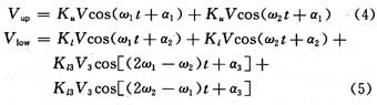 在图3中,输入信号ω1和ω2经过混频器Mixerl,根据混频器的原理,即产生混频信号2ω1,2ω2和ω1-ω2,与耦合出来的主信号同时送入混频器Mixer2,一个送入LO端,一个送入IF端,则输出为LO与IF信号的和与差,RF端输出就得到了2ω1-ω2,2ω2-ω1,ω1,ω2。可见,预失真器输出的信号中,产生了非线性分量,其中2ω1-ω2,2ω2-ω1,就是我们需要的预失真信号分量。