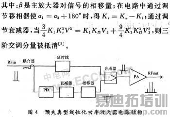 从原理上看,预失真线性化技术可能是改进线性特性的最简单的一项技术。文章采用的预失真电路原理框图如图1所示,即在RF放大器的前面加入一个预失真器,预失真器的非线性特性刚好与RF放大器的非线性特性刚好相反,信号输入端为_个功率分配器,他将输入信号分成2路,上一路通过一个相位延时器;下一路送入预失真器。信号通过预失真器生成非线性失真分量,即预失真信号。这一信号经过相移器和衰减器送入定向耦合器,与原输入信号进行混合,生成含有预失真分量的混合信号。该混合信号最后送到主放大器进行放大。由于混合信号中的非线性分量与由主放大器非线性所产生的非线性分量,在幅度上相等、相位上相反,从而抵消了输出信号中的非线性失真分量,这样就对RF放大器的输出进行一定的补偿,使得输出信号为基本无失真信号,达到线性化的目的。这种补偿原理如图2所示。当信号经过预失真器、延时器和RF放大器组成系统时,由于预失真器与RF放大器的相反的非线性特性,从而使得预失真部分的非线性和主放大部分的传输特性抵消,整体呈线性输出。