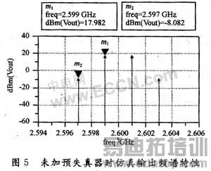 为了进一步验证这种预失真线性化技术的特性,借助于微波电路专用仿真软件ADS对电路进行仿真。在计算机仿真系统上设计了一个2.6 GHz频段的功率放大器,用中心频率为2.6 GHz、频率间隔为2 MHz的双音信号进行仿真得到图5所示的结果。从图5中可以看出,在加入2次混频预失真器前,3阶IMD大约为26.1 dBc,即出现了较为严重的非线性失真。构建与图4相同的系统仿真电路。通过反复、适当调整衰减器、移相器和延迟线的时间延迟量,可获得系统的最后输出信号的频谱图,如图6所示。通过与图5相比较可见,经过预失真线性化处理后,原输出信号中的IMD3接近65.3 dBc,三阶交调改善了39 dB左右。