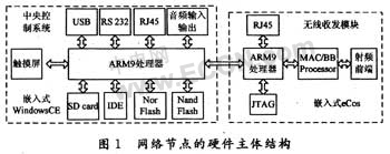 无线信息共享系统网络节点的硬件结构包括了两个主要模块:嵌入式中央控制模块和无线收发模块。嵌入式中央控制系统集成了ARM9处理器,RS 232接口,RJ 45接口,SD card接口,音频接口,IDE接口,可以方便地扩展音频视频等各种信息采集模块。无线收发模块集成了ARM9处理器和符合IEEE802.11g标准的射频前端。网络节点的硬件组成模块如图1所示,嵌入式中央控制模块通过交叉以太网线来完成对无线收发模块的控制。