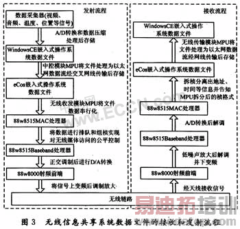 无线通信模块采用了Marvell公司的88w8000与88w8515芯片的组合,以eCos嵌入式可配置操作系统作为软件平台。eCos具有可配置性、可裁减性、可移植性和代码体积小的优势。他提供了功能强大的配置系统,可以在源码级实现对系统的配置和裁减,并且实现最小功能的eCos系统可以只有几百字节,方便的存储于FLASH。88w8515是集ARM9处理器、以太网MAC/BB处理器、IEEE802.11 MAC/BB处理器于一身的SoC,88w8000是工作于2.4 GHz频段的IEEE802.11g无线收发芯片。通过JTAG接口,我们可以对无线收发模块底层固件进行不断的修改和完善。整个无线信息共享系统工作时,数据文件在两个节点中的收发流程如图3所示。