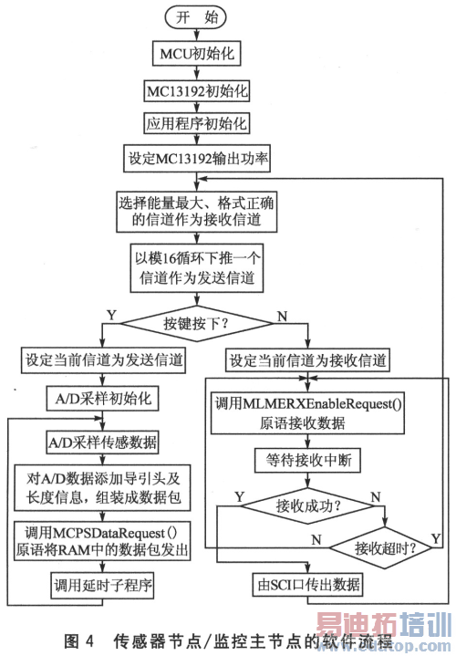 图3中仅列出了最简单的组网方式。如果地形需要所有的传感器节点按线型排开(如在煤矿隧道中的传感网络),则可以采用上述组网方法。组网采用的是 ZigBee技术,利用现代高级无线芯片(如Freescale公司的MC13192芯片),每个节点可以在网络初始化时对所有信道进行能量检测,从而选择最干净的信道进行信号的发送或转发。如果地形复杂,传感器节点遍布,则可以采用一个转发节点负责周围几个传感器节点的方式,信道选择的编程基本思想不变。