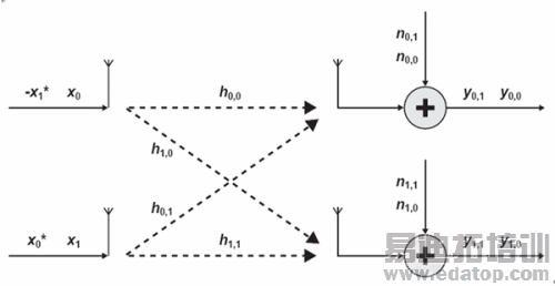 目前,最受欢迎的空时码是Alamouti码,已被许多无线标准采用。图2为典型Alamouti码,其数学方程式表述如下: