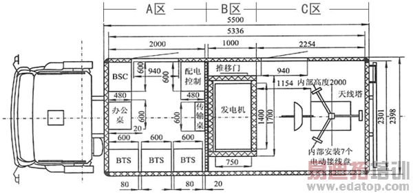 A(前)区为通信设备区,用于安放GSM通信、通信控制器、电源整流器、电池组、控制柜等主要设备。在A区内部安装空调器,在墙板上安装走线架、交流电源插座,顶部安装车用照明灯,车箱右侧开门,门外有梯子及扶手供工作人员安全上、下。