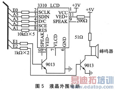 采用诺基亚3310 LCD显示模块。该LCD为84×48点阵的液晶屏,一屏可显示4×7个(12×12点阵)汉字,或6×14个(6×8点阵)英文、数字、标点符号等字符。该液晶显示器轻薄短小、低功耗电量,常用于手机显示。液晶外围电路如图5所示。