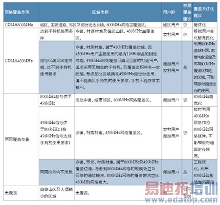 如表3所示,在不影响现有村通网络覆盖规模、减小对原有村通固定台用户的冲击、保证CDMA800MHz网络的正常发展的前提下,个别区域建议新增800MHz基站扩大覆盖面积或补网加强覆盖,蓝色部分为重点考虑的区域。覆盖优化或补网后,用户可使用双频终端实现两网间漫游切换,利用现有的450MHz网络完成CDMA800MHz网络暂时未覆盖地区的过渡。