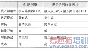 在4G中网络的设计架构将会简化。对于基于IP网络的宽带无线接入,可以有两种设计架构,一种是全IP网络架构,如图3所示。在这种网络设计模型中,基站不仅可以具有信号的物理传输功能,还可以对无线资源进行管理,扮演接入路由器的功能,缺点是会引入较大的开销,尤其是在移动终端进行切换时对移动IP地址进行的配置的过程。另一种是基于子网的IP架构,如图4所示,其中几个相邻基站组成子网接入基于IP接入网的路由器。这时,基站和接入路由器分别负责管理第二层和第三层的协议,当用户在相邻基站间发生切换时,只涉及到第二层的切换协议,不需要改变第三层的移动IP的地址。表1是两种网络的比较。