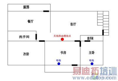如图所示,书房外墙处是摆放无线路由器的理想位置,这样摆放能够使客厅,书房,主卧,次卧都有一个比较好无线信号。当然,不同家庭结构都不一样,大家应该视具体情况而定。一般来说,无线网卡的客户端都具备信号强度的检测能力,大家拿笔记本在房间各处查看信号强度,从而选择一个最佳的摆放点。另外也可以安装Network Stumbler软件来检测信号的强度。