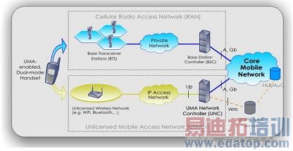 UMA(Unlicensed Mobile Access,无牌照移动接入)是最近在北美、欧洲发展起来的新标准,主要解决WLAN、蓝牙与移动网络的集成,可通过WLAN、蓝牙等无需频率牌照的无线技术传输CDMA、GSM的话音和数据。