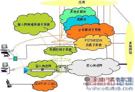 与软交换技术相比,IMS具有接入无关性,这一特征也构成了IMS的核心技术优势。IMS网络的通信端点(终端)与网络都是基于IP的。在3GPP的规范中,这是通过IP连通接入网络(IP Connectivity Accsess Netwrok,IP-CAN)来保证的。例如,WCDMA的无线接入网络(RAN)以及之上的分组域(PS domain)网络构成了目前最主要的IP-CAN,用户通过PS域的GGSN接入到外部IP网络。今后为支持WLAN/WiMAX/xDSL等不同的接入技术时,可能会产生新的IP-CAN类型,图3为一种可行的架构。