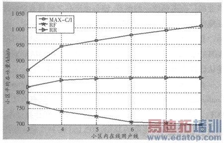 仿真考察在多小区多用户环境下的吞吐量性能,此时用户将同时受到本小区和相邻小区的干扰。小区内有多个用户在线时,随着小区用户数的增加,MAX-C/I和PF调度算法下的小区吞吐量都有所上升,这种由小区用户数增加而带来的吞吐量上升,被称为多用户分集增益。从图3可以看到,MAX-C/I下的吞吐量上升最为明显,这和调度算法本身的特性是相吻合的,在多用户下,MAX-C/I算法总能调度到信道质量最好的用户,选用高阶的调制方式以及更大的TBS传输,从而提高小区吞吐量。而RR调度算法与用户信道质量无关,被轮循调度到的用户的信道质量可能会比较差,而这种情况在多用户数下出现的几率更大,所以影响了小区吞吐量的提升。PF算法由于兼顾了用户信道质量以及调度的公平性,所以吞吐量上升不如MAX-C/I算法显著。多用户分集增益也比较有限,随着在线用户数的进一步增加,小区吞吐量也将趋于平稳。