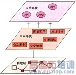 从图1中可看出基于IP技术的网络架构使得用户在2G、3G、4G、WLAN、固定网之间无缝漫游可以实现。我们可将系统网络体系结构分为三层,如图2所示: