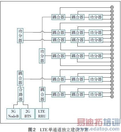 由于LTE室分与2G/3G室分物理上完全隔离,因此在建设和改造过程中均不会影响现有系统运行,而且可以对LTE系统独立进行规划优化。由于单通道的性能不如双通道系统,因此该方案适用于非热点区域。