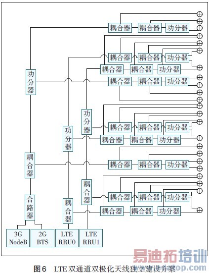 此方案中,其中一路LTE需要单独建设天馈系统,新增1路馈线和1套无源器件(包括功分器和耦合器等),同时将原室分天线更换为双极化天线。另外,需要对原2G/3G分布系统的器件进行改造(包括无源器件和天线)以适应LTE频段的要求。这种方案需要改造现有室分系统,增加合路后可能会对现有系统的性能造成影响,但实现MIMO,能够带来较好的用户体验与容量。