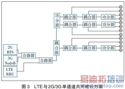 单通道共用建设方案是指LTE采用单通道设置,使用1路射频单元,不实现MIMO,在室内分布建设中与2G/3G共用天馈系统,如图3所示。