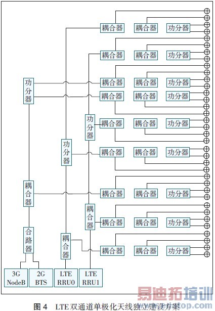 双通道单极化天线独立建设方案是指LTE采用双通道设置,使用2路射频单元,实现MIMO,在室内分布建设中与2G/3G独立建设,采用独立的天馈系统且LTE每路射频通过单极化天线的方式进行覆盖,如图4所示。