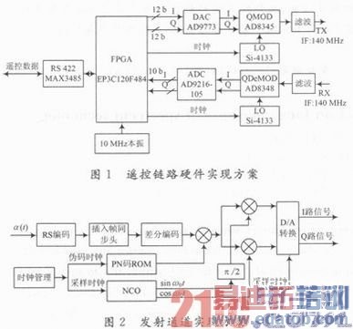 总体硬件实现方案如图1所示。采用收发一体的数字基带处理结构,收发通道在单片FPGA内完成。FPGA选用Altera公司的EP3C120F484,主要的功能都在片内完成,正交下变频解调器选用AD8348,它将中频140 MHz信号正交下变频到基带,形成I/Q两路正交信号,由ADC(AD92 16)完成基带信号的模-数转换,将形成的数字信号传输给FPGA。Si-4133产生中频本振,其工作频率为280 MHz,参考本振为10 MHz。主机接口芯片选用MAX3485,RS 422接口芯片,把解调后的信息传输给主机。其工作时钟频率为波特率的16倍。