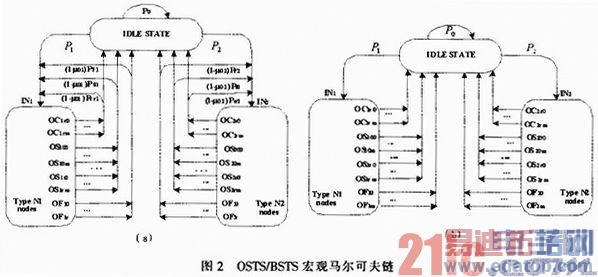 文中的分析建立在我们前期的工作基础上,其分析模型和假设都如前所述,且状态转移概率表达式都如文献所示的式(1—11),这里不再赘述,只是列出了模型的示意图,如图1、图2(a)、图2(b)所示。如前所述,OSTS机制指的是在竞争信道过程中,获取信道的节点传送其缓存中的一个数据包,传送完该数据包后,重新参与竞争信道以传送其缓存中其他数据包;而BSTS机制指的是在竞争信道过程中,一旦获取信道节点将其缓存中的所有数据包一次性传送完成,然后直接进入休眠状态。