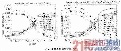 从图4(a)中可以看出,在数据包到达率差异较大时,BSTS机制的公平性比其他几种机制的公平性要高;在数据包到达率差异较小时,OSTS机制的公平性比其他几种机制的公平性要高。例如,BSTS机制中节点N1和节点N2的吞吐量在lnR=-2时分别为0.099 8和0.123 8,在lnR=-1.5时的吞吐量分别为0.102 0和0.124 3。那么BSTS的带宽分布在lnR=-2时为0.899 2/1,在lnR=-1.5时为0.924 1/1,这个带宽分布比Sarmiento机制在lnR:一2时为0.872 l/1,在lnR=-1.5时为0.924 1/1,Ramaehandran机制在InR=-2时为0.869 3/1,在lnR=-1.5时为0.889 2/1这两种情况的公平性要高。同时,传输率也可以用来评价公平性,如图4(b)所示,各种机制的传输率分析与吞吐量的分析相似。