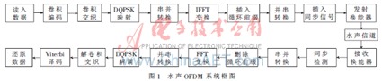 图1为水声OFDM基带通信系统图[3]。由于水声信道存在严重的频率选择性衰落,采用卷积编码实现各个子载波上的纠错。为了抵抗由于时变带来的突发错误,采用交织技术将突发错误打散为随机错误。对卷积交织后的串行数据流进行DQPSK映射、IFFT、插入循环前缀以及并串转换后形成OFDM符号,加入同步前导符号后经水声信道发送出去。在接收端提取同步信息后,经过一系列与发送端相反的逆过程实现OFDM解调,解调后的数据流再经过解交织和Viterbi译码后还原数据信息。