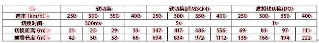在切换区大小不变的前提下,速度越快的终端穿过切换区的时间越小。因此,当终端的移动速度足够快,以至于穿过切换区的时间小于系统处理的软切换最小时延,此时会导致掉话产生。在对高速铁路覆盖基站的参数设置时需要考虑设置最小的切换区,满足高速火车在高速运行时的切换需求。最小切换区的大小可根据列车时速大小与软切换时延计算而得。软切换时延一般取300ms,因此,最小切换区大小主要取决于列车移动速度。