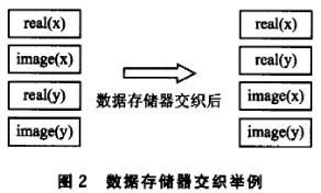 数据存储器交织的目的是通过重新排列数据在存储器中的位置,以使得程序读写数据的时间最短,比如有2个8位的复数x和y,一般情况下,复数将按下列顺序存入内存:real(x),image(x),real(y),image(y)。但如果想使得读取复数的实部更容易,可以把数据重新排列如下:real(x),real(y),image(x),image(y),如图2所示。
