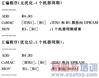 如果在流水线上的指令在同一时间访问同一内存,就会发生内存带宽冲突,MAC单元的CoXXX指令是特别为实现DSP设计的。为了避免在DPRAM中发生带宽冲突,CoXXX指令的其中一个操作数必须放在SRAM中,以保证在单个机器周期内执行MAC单元指令。例如: