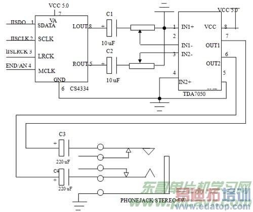 图2S3C44B0X与CS4334以及TDA7050的连接示意图