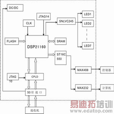 1.首先考虑数据传输。外部设备(接收机)通过50针接口将数据经ADSP21160处理后转换成串行数据输出,传递给外设(控制器)及计算机。为了电路系统的保密性以及便于系统中一些逻辑控制电路的实现,在ADSP21160和50针接口之间增加了一个CPLD控制电路。