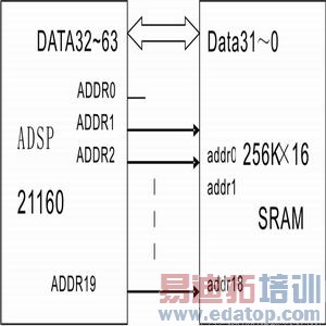 在地址线的连接上,和一般的接法梢有不同。由于ADSP21160规定,对外部空间的寻址,其奇地址通过低32位数据线传递;偶地址通过高32位数据线传递。考虑到在FLASH的连接上使用了DSP数据线的32_39位,为了简化今后PCB板的布线及充分利用SRAM的存储空间,在设计中,将ADSP21160的ADDR0的引脚悬空,将其ADDR1引脚与SRAM的addr0管脚相连,ADDR2与addr1相连,以下顺次连接。