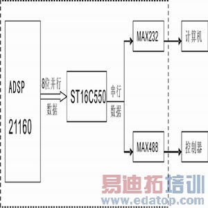 在本系统的设计中,其中间运算数据均采用32位浮点数,输出结果截取8位有效数字,通过并串转换器(ST16C550)转换成串行数据,再分成两路,一路经过MAX488转换成差分数据输送的外部控制器,另一路经过MAX232转换电平,连接到计算机,实现了系统要求的功能,如图3所示。