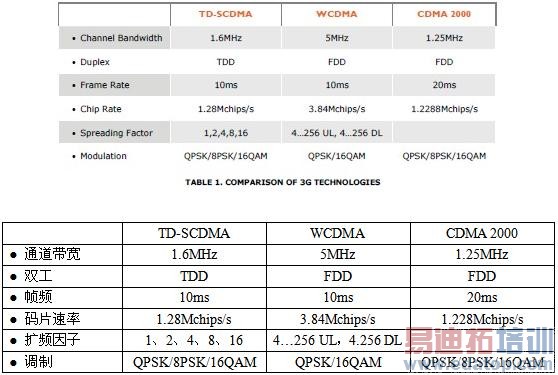 3G技术比较见表1。可以看出,TD-SCDMA与WCDMA和CDMA2000有许多类似的地方,但是都具备自己独有的特性。WCDMA与CDMA2000都属于频分多址技术。WCDMA需要两个独立的5MHz宽频谱带,一个用于下行传输(从发射塔到手机),另一个用于上行传输(从手机到发射塔),CDMA2000也需要两个1.25MHz频带。而TD-SCDMA仅需要一个1.6MHz频带,便可以满足上行和下行的传输。换句话说,TD-SCDMA仅需要频谱资源的1/6至2/3。在现有频谱紧缺的状况下,需要尽量少的频带可使部署移动网络更加简单。同时,它也节约了网络和终端设备的制作成本,因为需要采样的频带缩小。此外,由于上下行射频(RF)链工作于同一频带,因而可以很大程度地进行再利用。