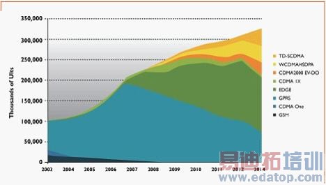 2009年1月,中国政府发放3G牌照。中国移动?接管TD-SCDMA网络,中国联通?和中国电信?分别接管WCDMA和CDMA网络。根据他们2010年发布的年度报告,中国移动已经部署了19.9万多个基站,到2011年中期将覆盖656个城市。据称,中国3G用户市场呈现井喷态势。而根据iSuppli2的市场分析,中国移动将在中国3G用户市场占据最大份额。图2是iSuppli?按照接入技术对2010-2014年的手机市场所做的预测。自从TD商用之后,中国移动便通过投资产业链推动TD市场。到2010年末,中国移动已经拥有2000万用户,截止2011年11月底,TD用户已突破4800万,2011年,TD用户有望净增3000万。