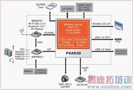 认识到TD-SCDMA在中国的市场潜力,Marvell于2008年做出了一项战略投资决策,即开发支持TD-SCDMA技术的单芯片智能手机解决方案。基于Marvell前沿的单芯片技术以及与中国移动的合作伙伴关系,开发了世界上第一个商用化的TD-SCDMA单芯片解决方案——Marvell PXA920平台,这款平台集高性能、低功耗的应用处理器和先进的多模调制解调器于一体,同时支持GSM/EDGE网络和TD-SCDMA网络。PXA920框图如图3所示。
