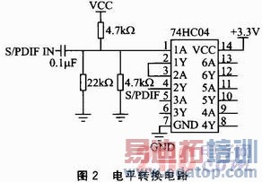 S/PDIF同轴线传输的信号合并了数据和时钟信号,频率高且具有尖锐的边缘特性。同轴线具有75 Ω的特性阻抗,并且输出的S/PDIF信号电压只有0.5 Vpp,不能直接连接CMOS芯片。所以要将输出的S/PDIF信号通过电平转换,使其能够直接输入到nRF24Z1芯片的S/PDIF输入引脚。电平转换电路如图2所示。