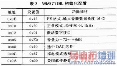 接收端收到数字音频无线信号后,可分别通过S/PDIF或I2S接口输出音频信号。本文采用I2S接口输出,并选用WM8711BL的DAC芯片进行数模转换,输出模拟音频并用耳机接收。WM8711BL芯片具有I2C总线接口,采用PIC18系列单片机对其相应的寄存器地址进行初始化配置。WM8711BL初始化配置如表3所列。