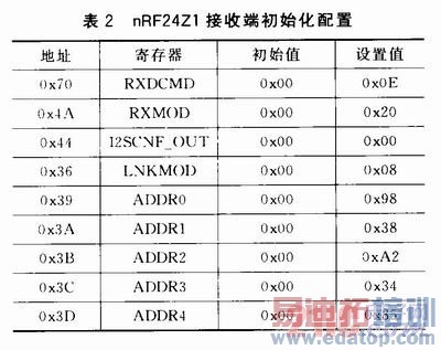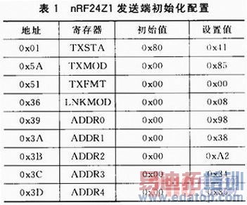 nRF24Z1的ATX端接入+5 V直流电源,ARX端接上+3 V电压后,nRF24Z1执行上电复位。上电后,单片机先完成自身的初始化配置,并完成nRF24Z1相应寄存器的初始化配置。nRF24Z1发送端初始化配置如表1所列。