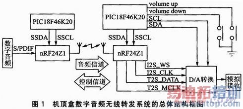 机顶盒数字音频无线转发系统的总体结构框图如图1所示。系统主要由数字音频信号的提取与传输、数字音频无线发送、数字音频无线接收三部分组成。大部分的机顶盒都具有数字音频S/PDIF输出接口,且一般采用同轴线输出。射频芯片nRF24Z1既可用在音源端发送音频数据,也可用在接收端接收音频数据。采用PIC18系列单片机配置射频芯片相应的寄存器,实现数字音频无线发送与接收。nRF24Z1芯片经过内部处理后输出I2S数字音频信号,送至数模转换芯片以及外围电路处理,实现模拟接收。同时,采用单片机控制音量的增减。