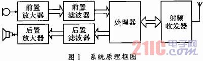 前置放大器完成对咪头微弱信号的放大,以便与ADC的满度测量范围相匹配,提高信噪比;前置低通滤波器滤除高于采样频率1/2的信号,即堆叠信号,以减小语音失真;嵌入式处理器完成数据处理及发送接收;射频收发器CC2420完成数据的收/发,接收/发送该设备的数据,并将数据发送到嵌入式处理器。后置低通滤波器对经过D/A变换的语音信号滤波,还原语音信号。采用低噪声、非斩波稳零的双极性运放设计成二阶有源滤波电路。音频放大器对经过滤波的语音信号放大,提高负载能力,输出到扬声器,最终实现无线语音通信。电路外围元件少,电压增益可调。