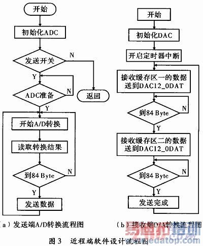 近程端将接收到的语音采集数据进行还原。D/A转换时钟设置与A/D转换同步。并且也采用10 kHz的频率。用单片机的定时器A模块,每100μs产生一次中断,在中断中进行一次D/A转换。一个ADC的输入缓冲区或一个DAC的输出缓冲区的大小为84Byte。装满这些缓冲区需要8.4 ms。系统流程图如图3所示。