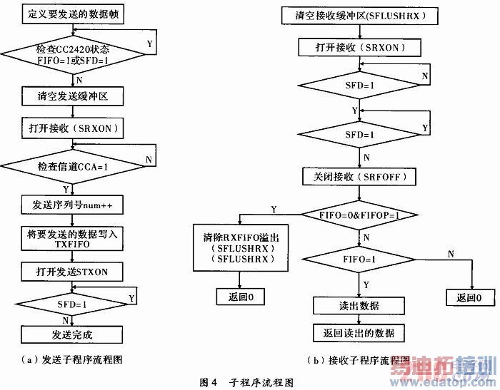 发送端获取了A/D转换的结果,并存储于所开设的缓存中。在发送数据时,将存于缓存的数据,加上网络层MAC层和物理层的帧头,通过SPI总线发送到射频发射芯片的发送FIFO中。为简化传输数据,采用16位短地址寻址而非64位IEEE地址。接收数据时,首先射频发射芯片监听信道中的数据,判断数据是否发送该设备。如果是,则读取该数据到接收FIFO,然后触发,通过SPI总线将数据发送到MCU;通过MCU处理,去掉各层的帧头,最后将数据存放到指定的缓存区中。具体完成发送接收部分的子程序流程如图4所示。